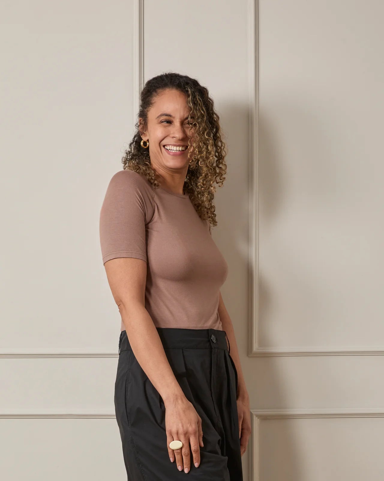 The Maddie top is the perfect everyday garment for layering or wearing on its own. Made from soft jersey fabric, it features a round neck and short sleeves, offering both comfort and simplicity.