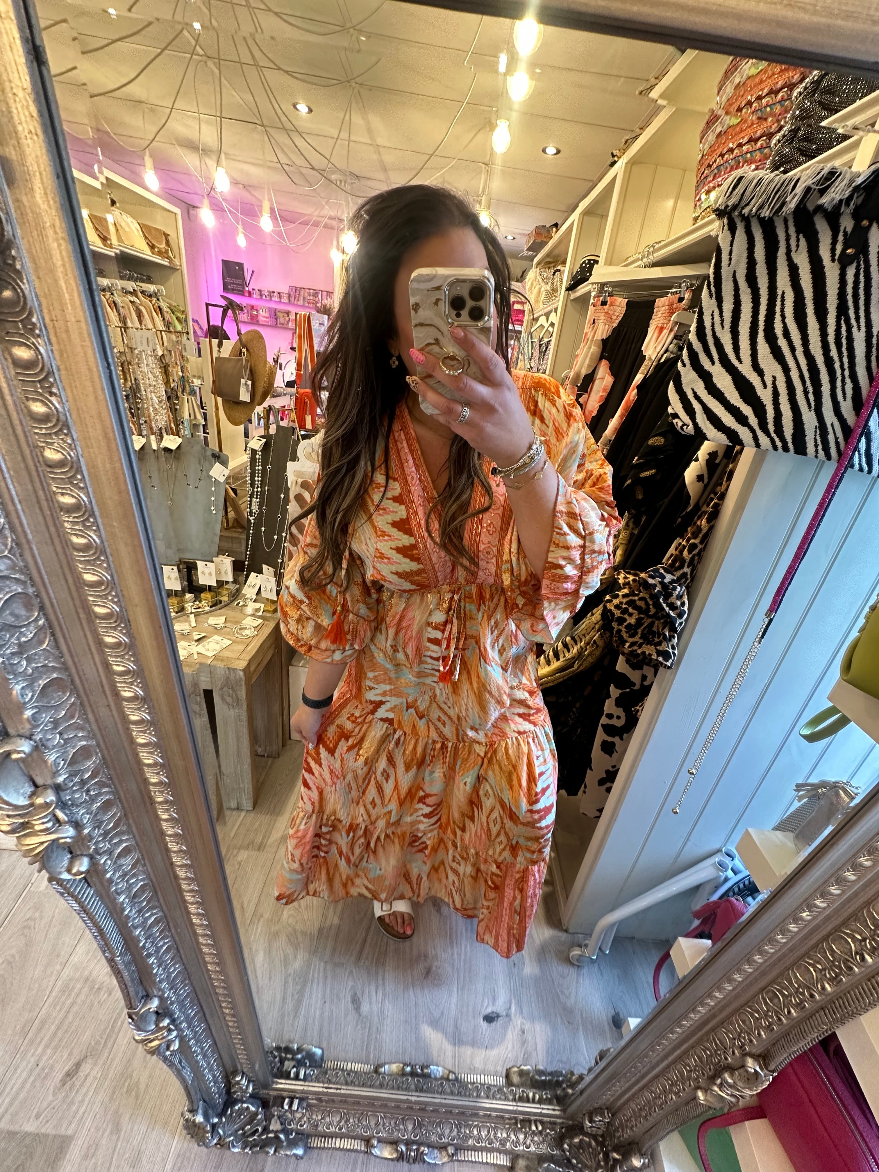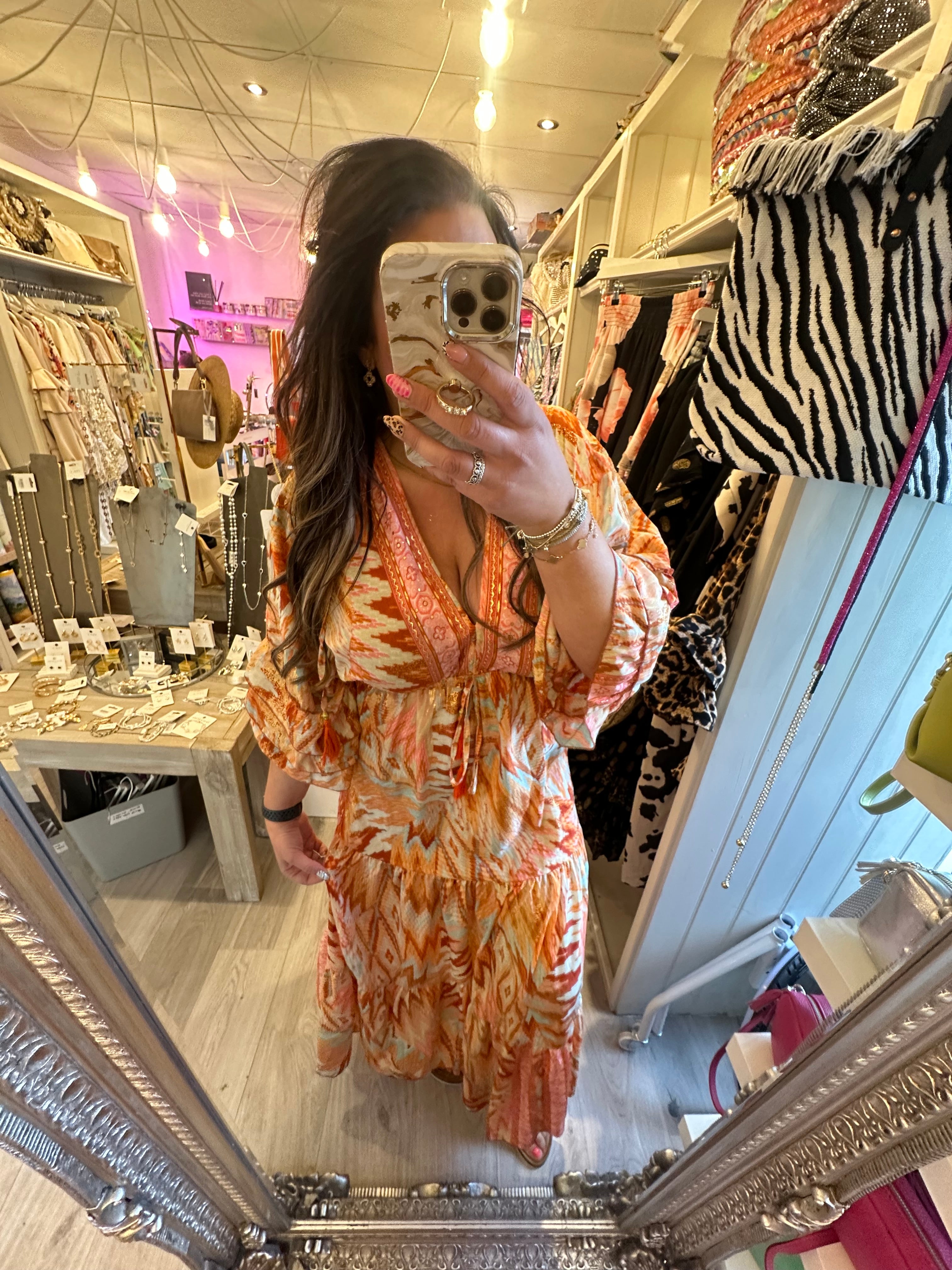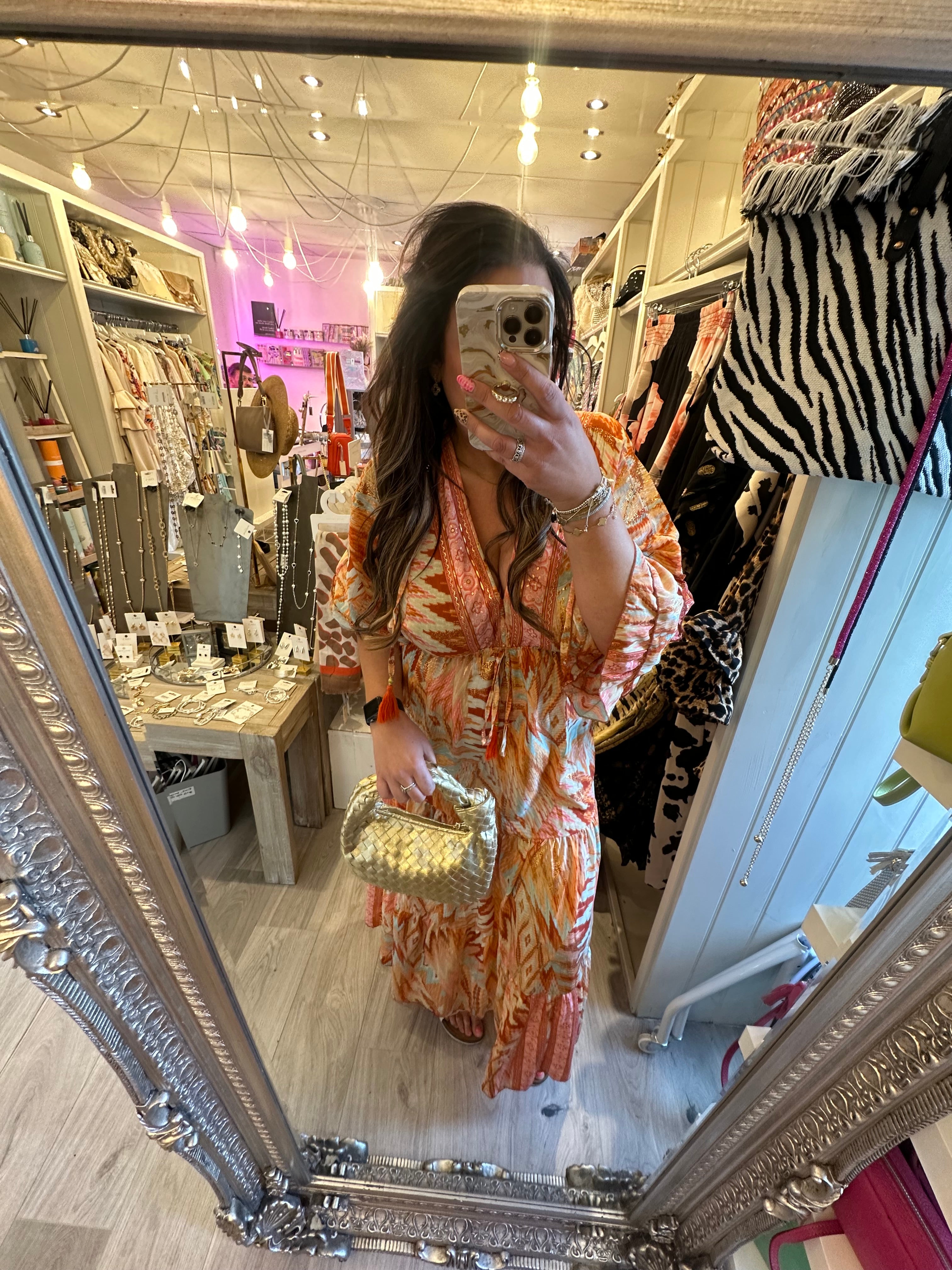 Orange/coral gold detail boho dress