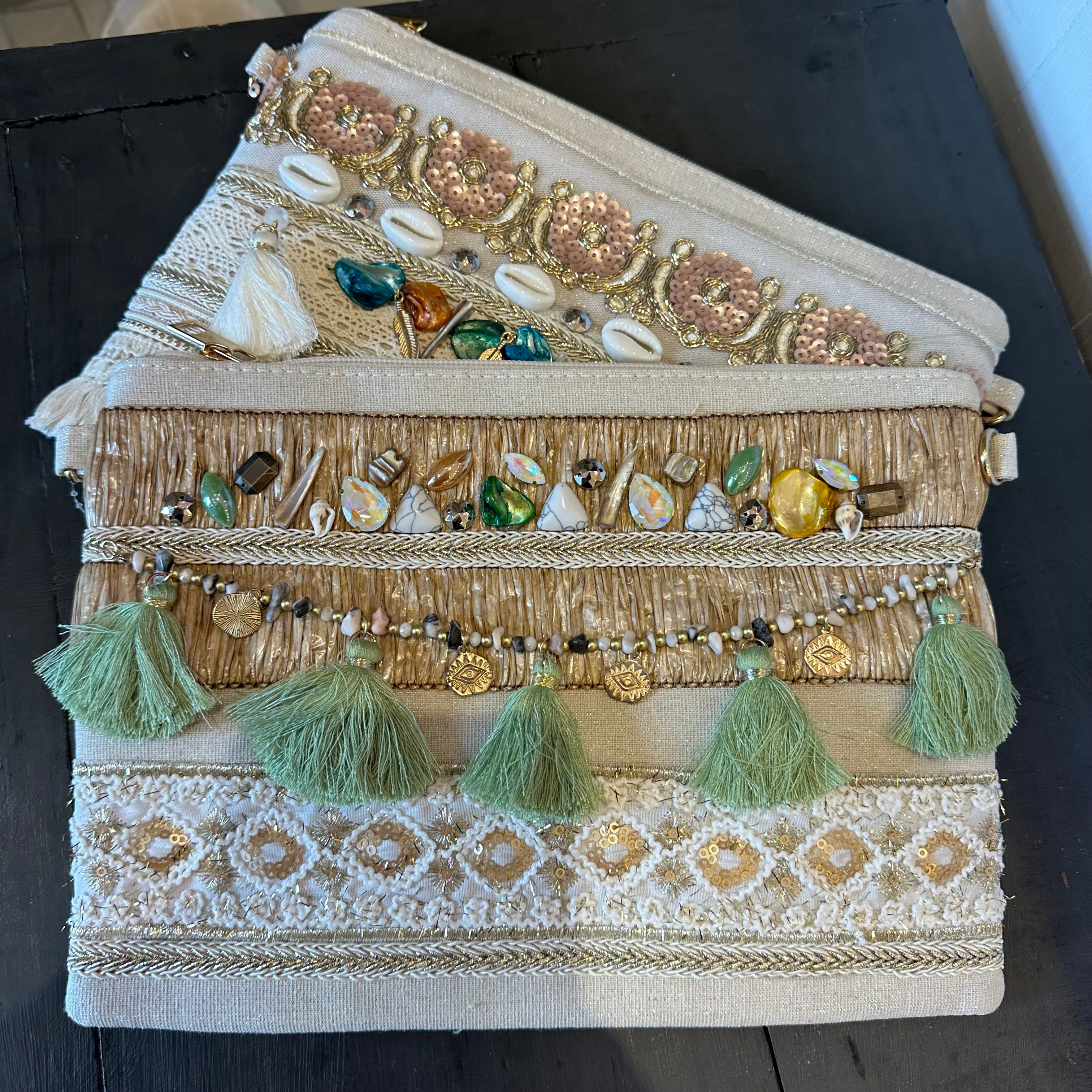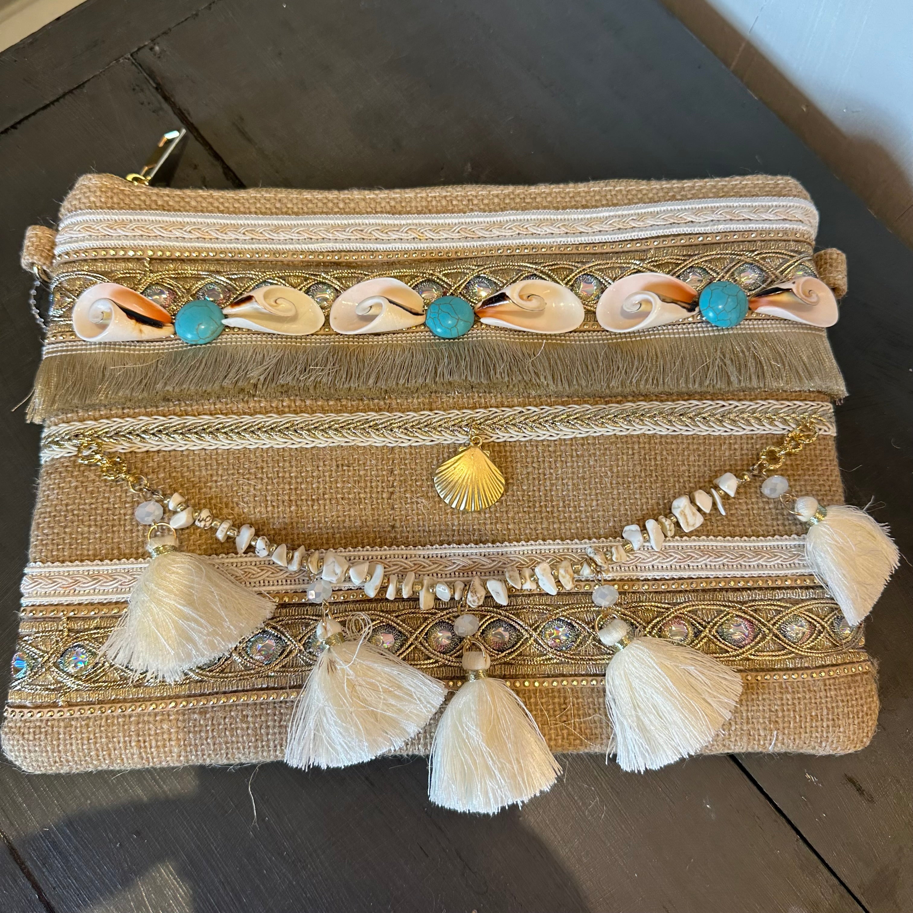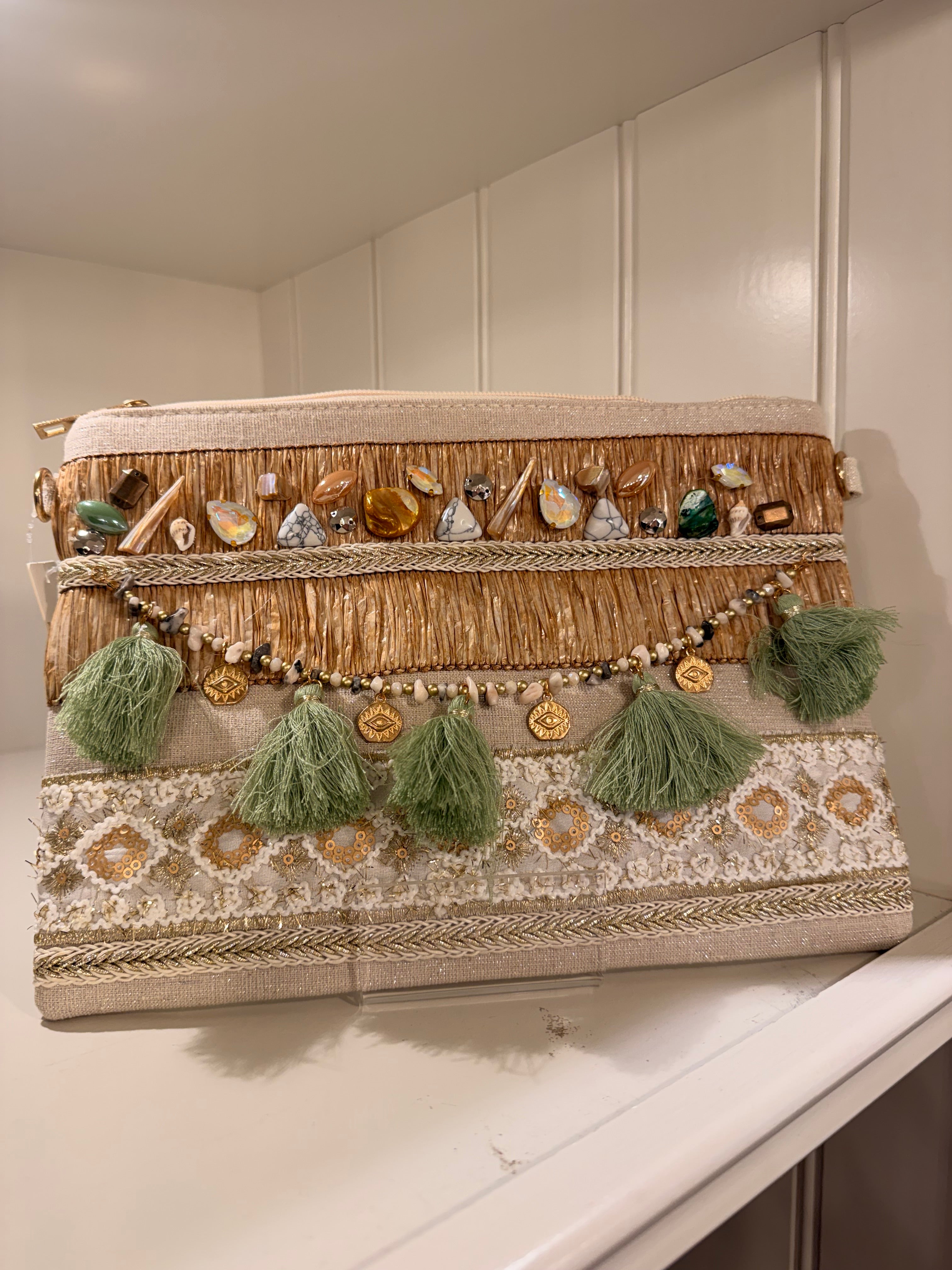 Embellished shell clutch bags - Green tassle is backordered and will ship as soon as it is back in stock.