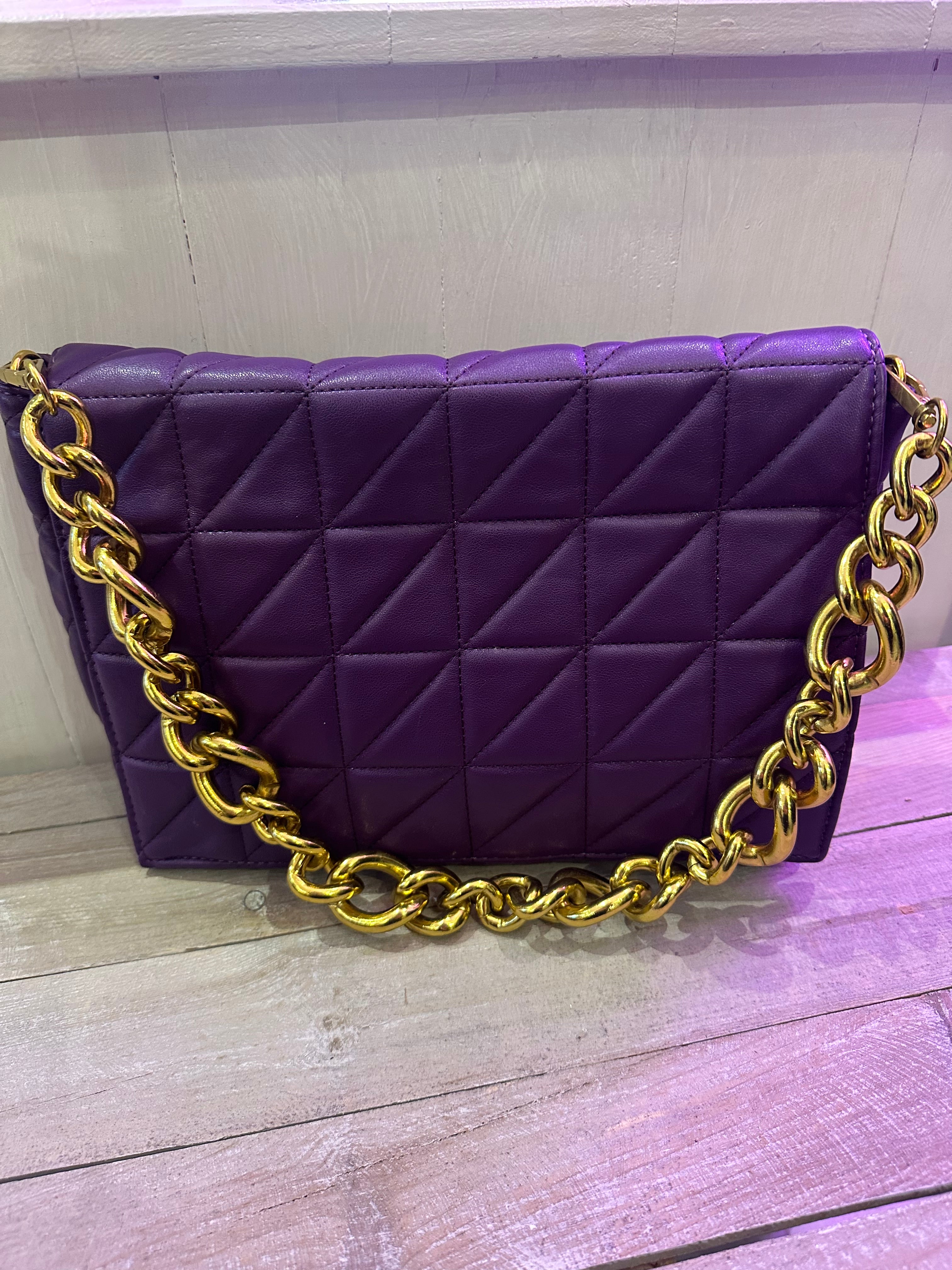 Purple heavy chain clutch with removable strap is backordered and will ship as soon as it is back in stock.
