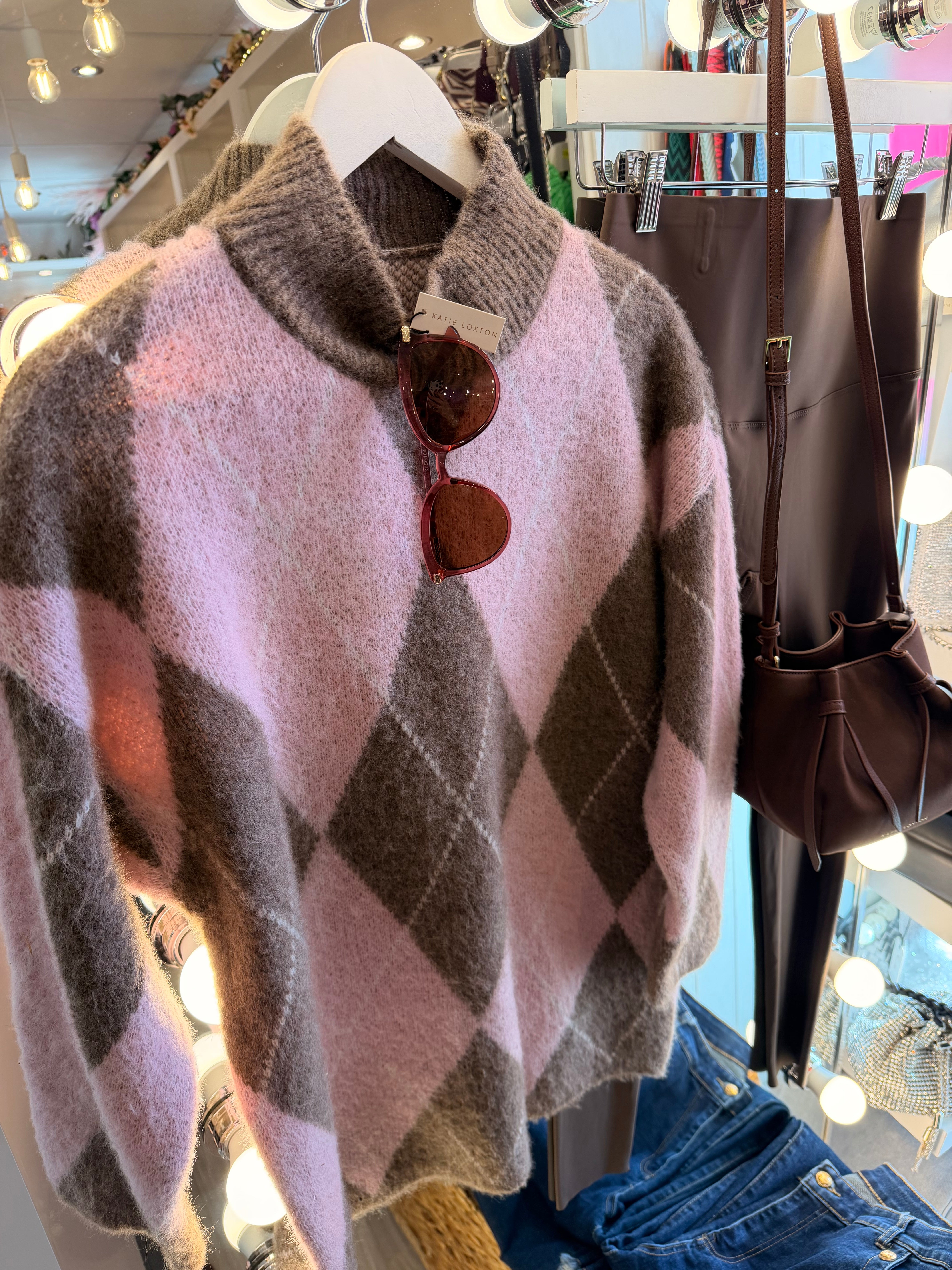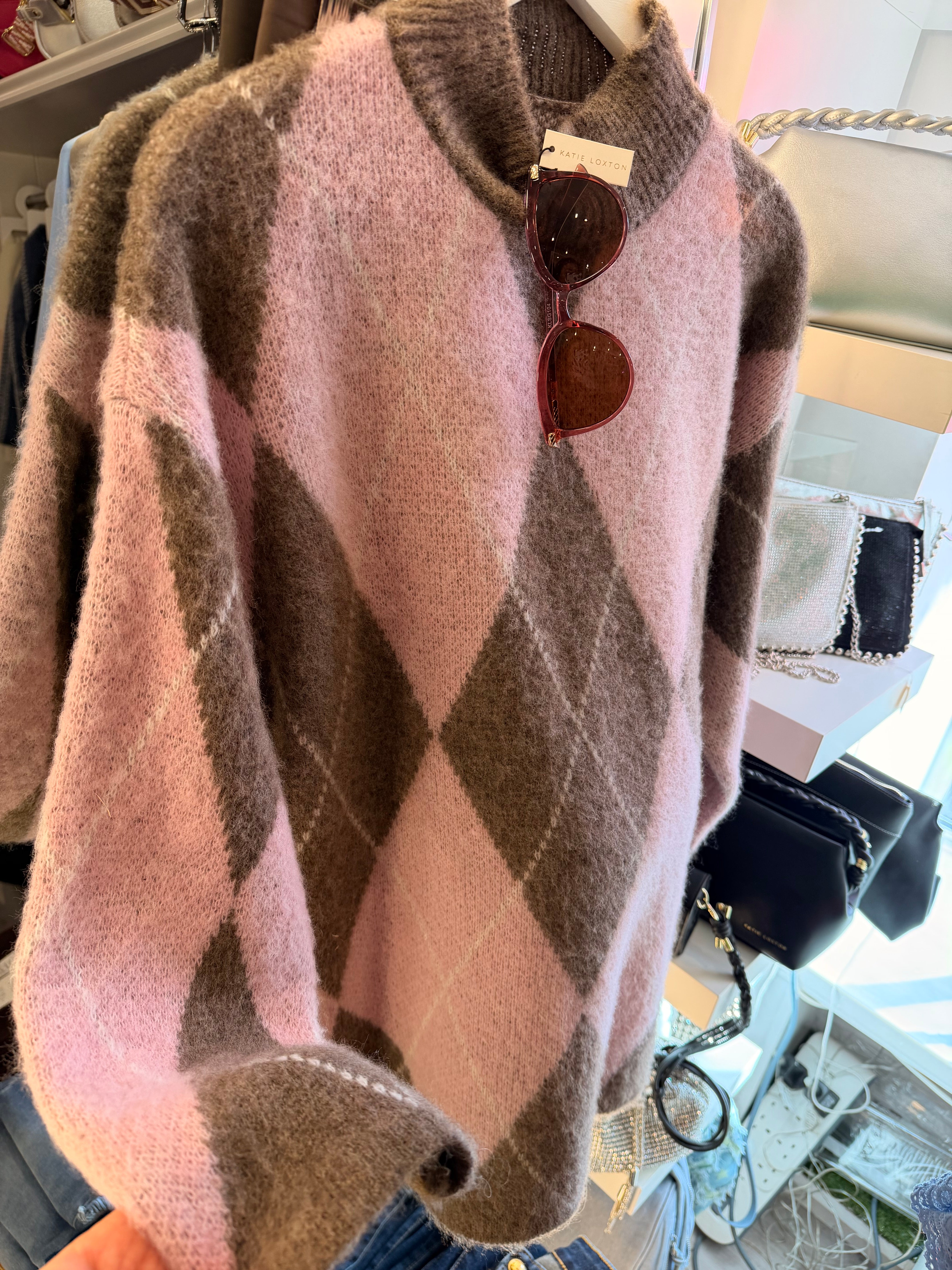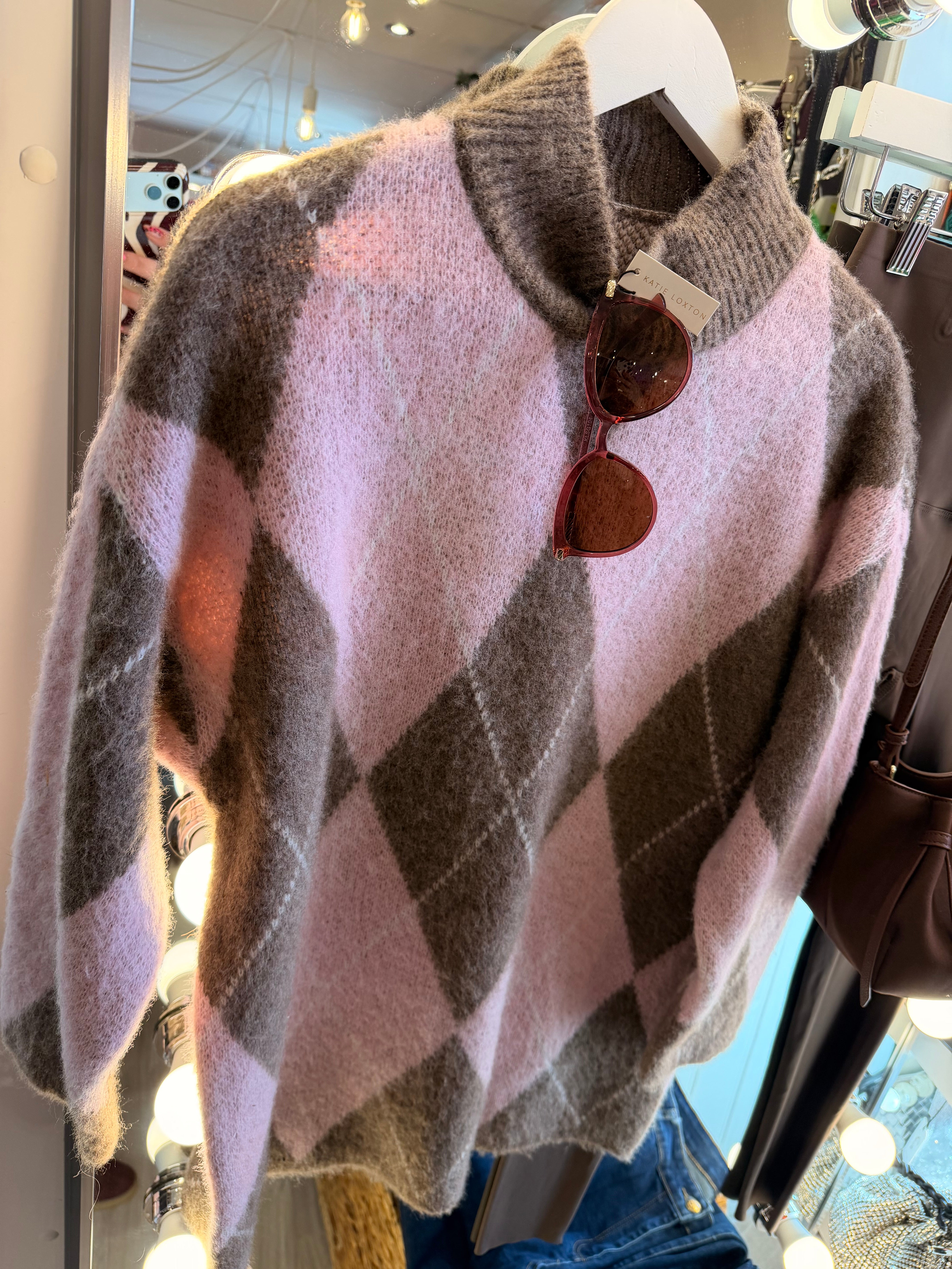 Argyle soft knit jumper - brown&pink