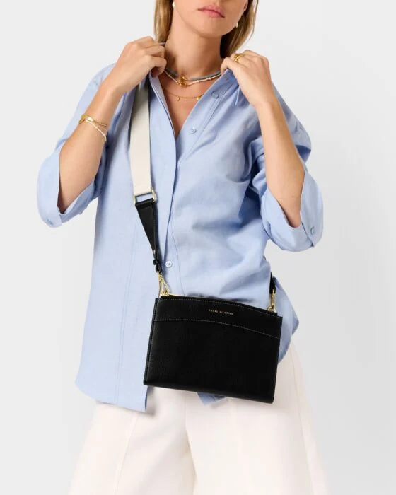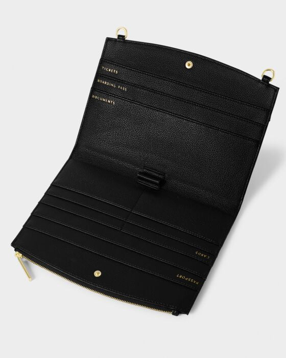 Our Travel Organiser Crossbody in Black features an elevated curved design, complete with internal pockets and card slots to neatly store your travel essentials, including your passport, boarding pass, and ID. It even includes a convenient pen loop. Each section is thoughtfully labelled to help you find your belongings quickly, while the secure zip and popper closure provides extra peace of mind throughout your journey.