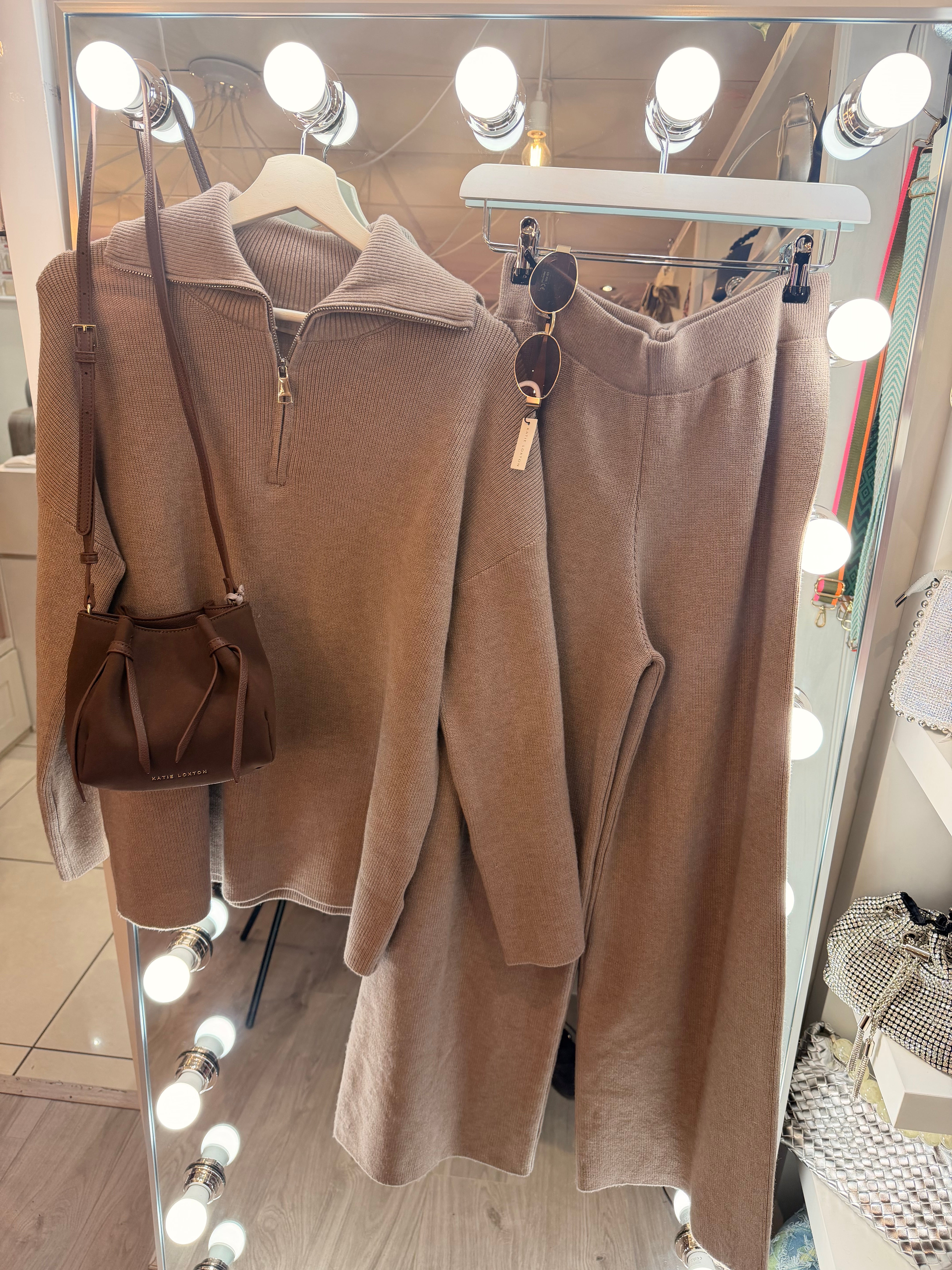 Mocha soft fine knit quarter zip co-ord - S/m is backordered and will ship as soon as it is back in stock.
