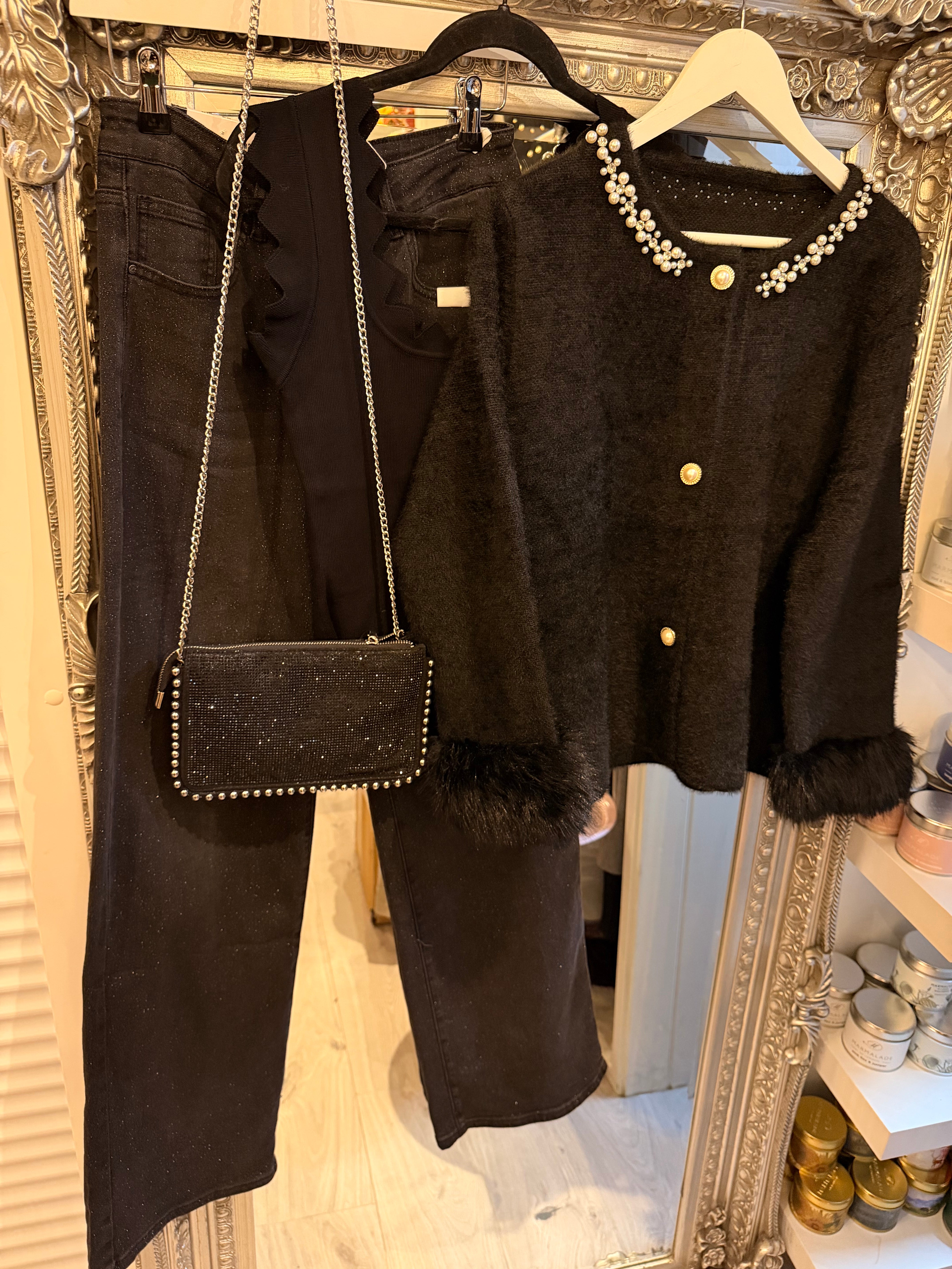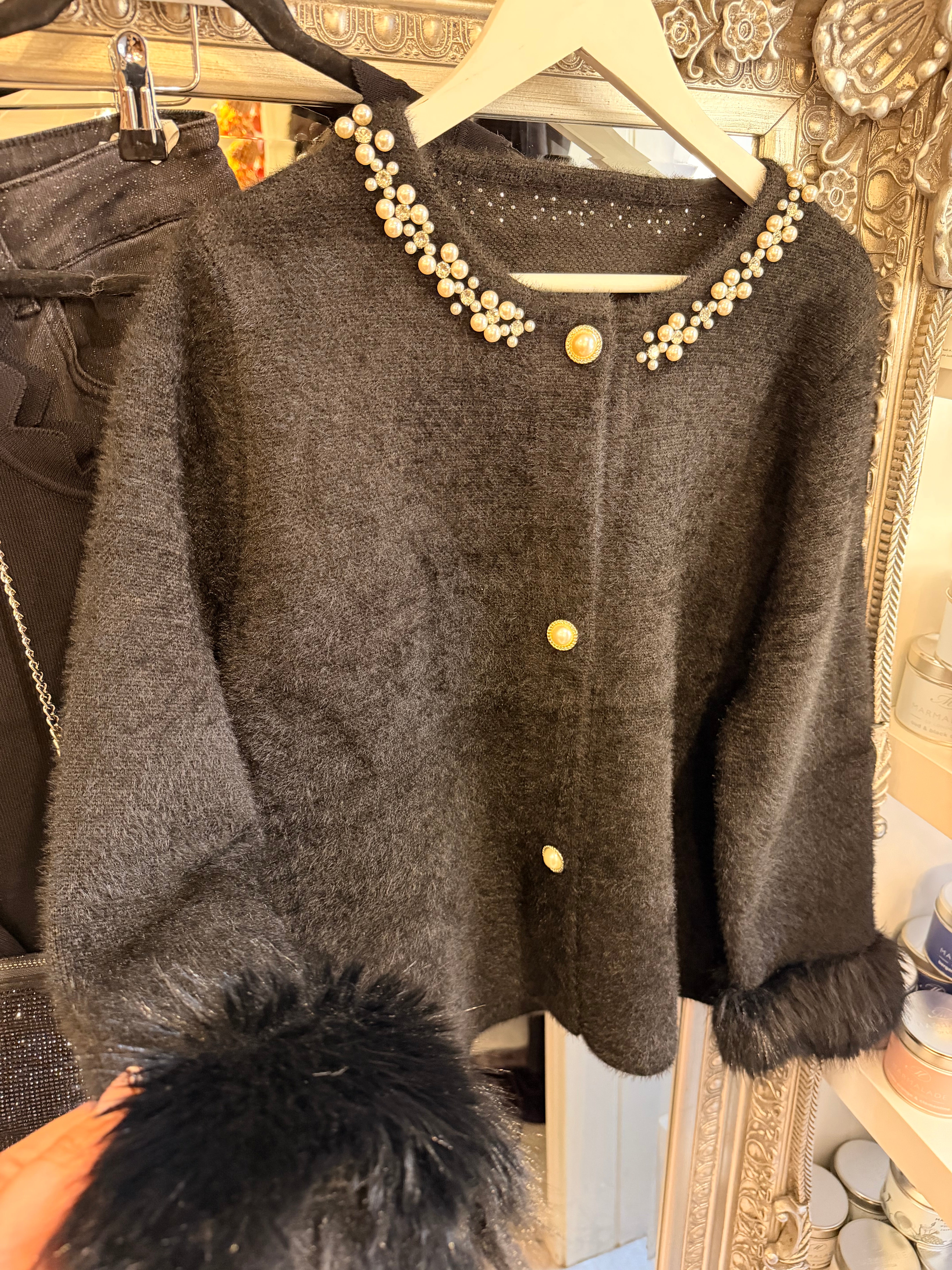 Faux fur cuff black pearl cardigan