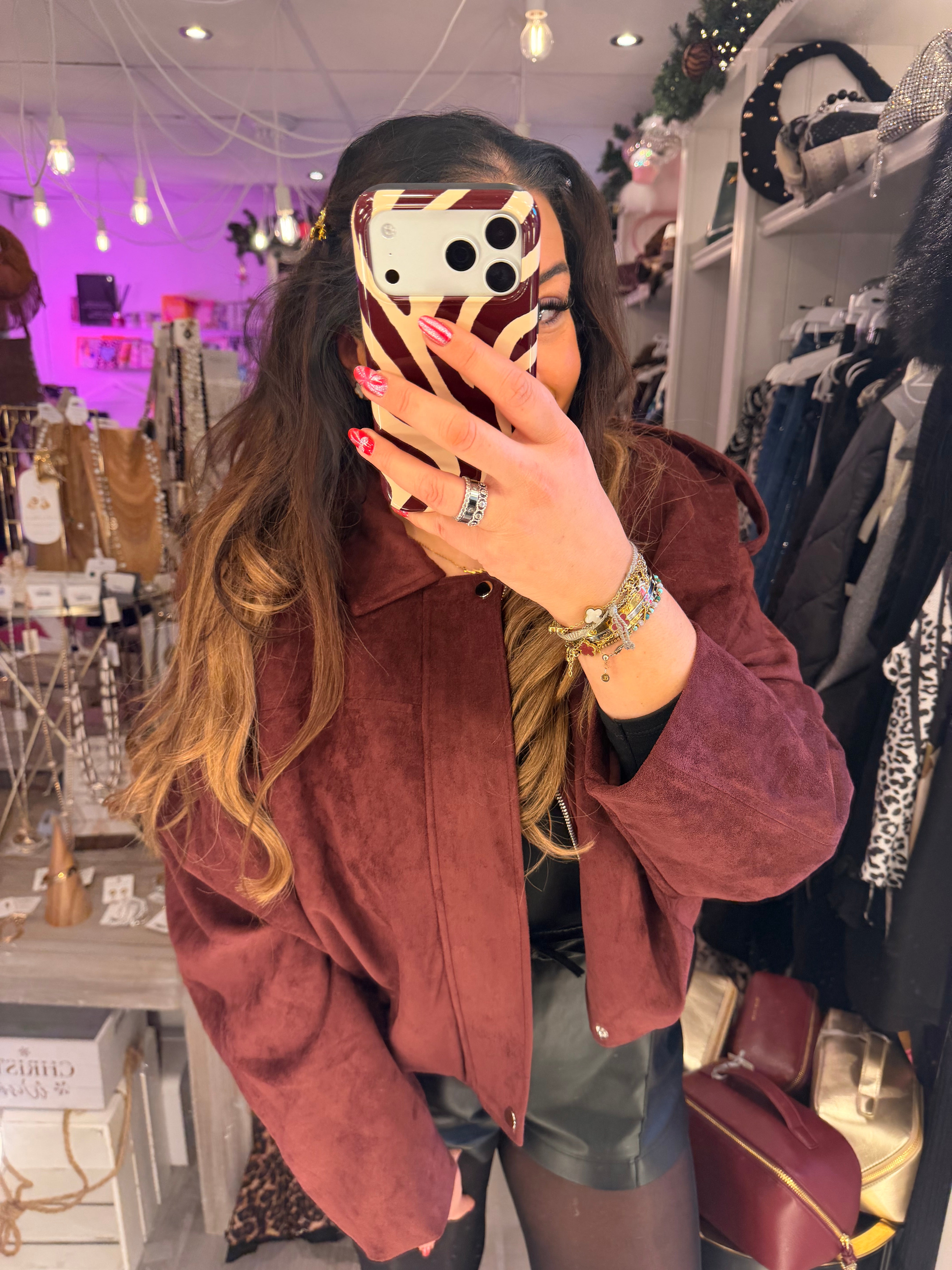 Wine oversized faux suede bomber jacket