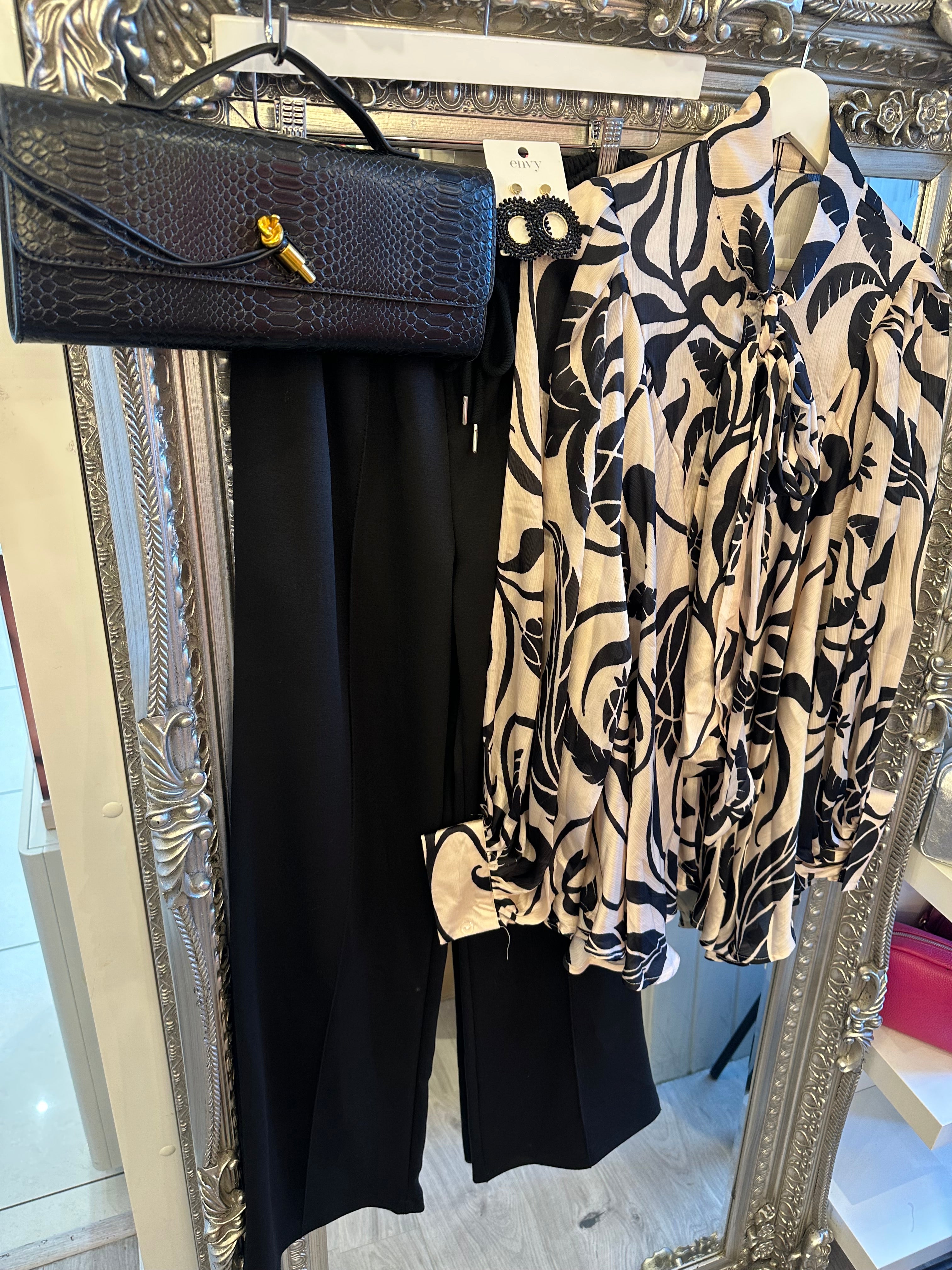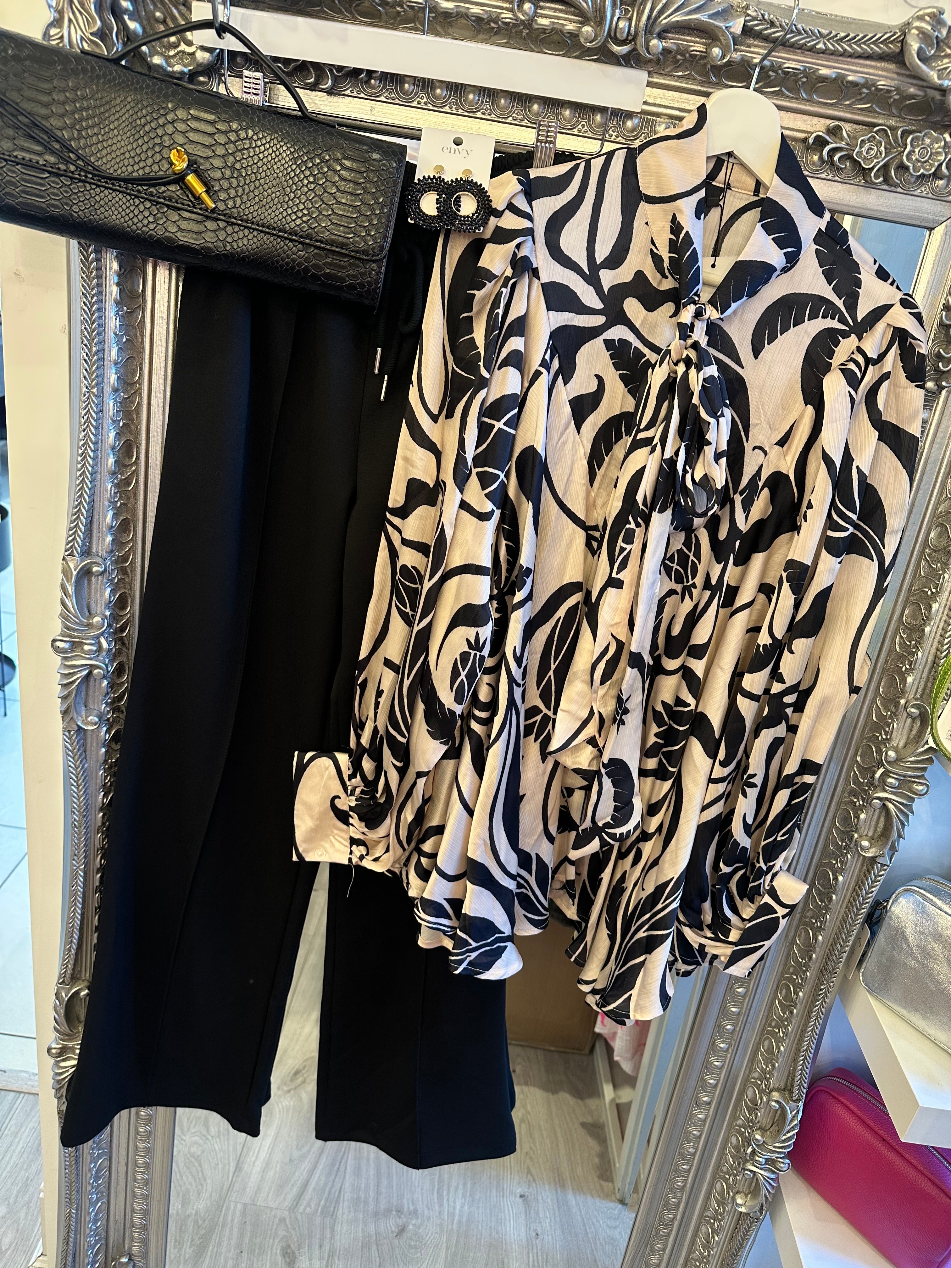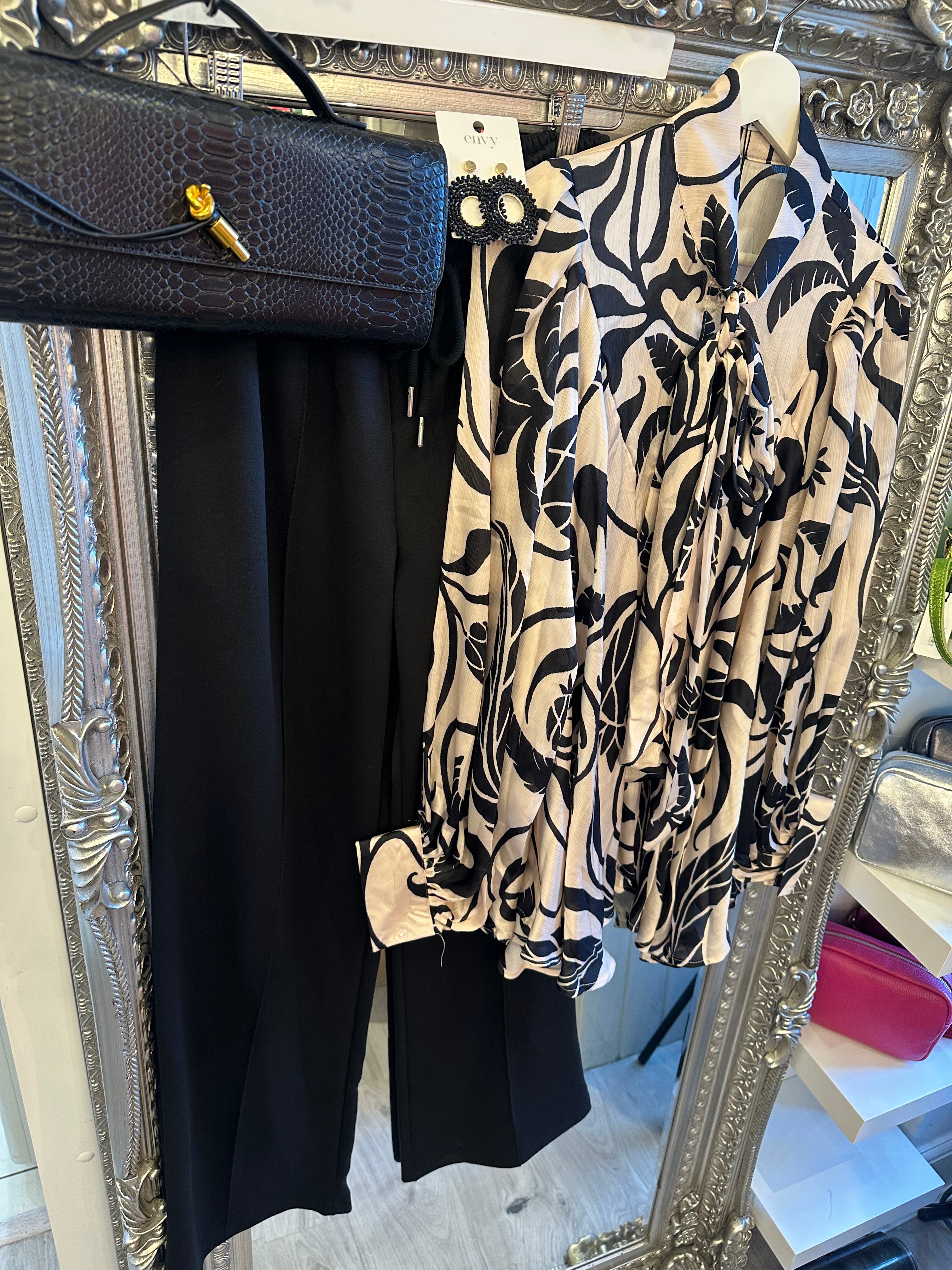 Black and white pattern pussybow blouse