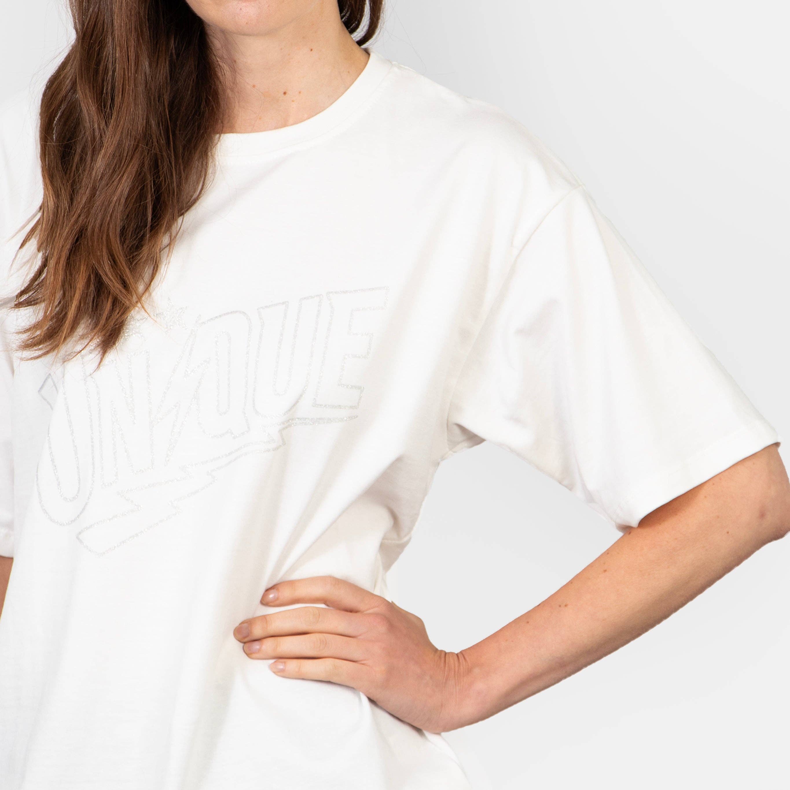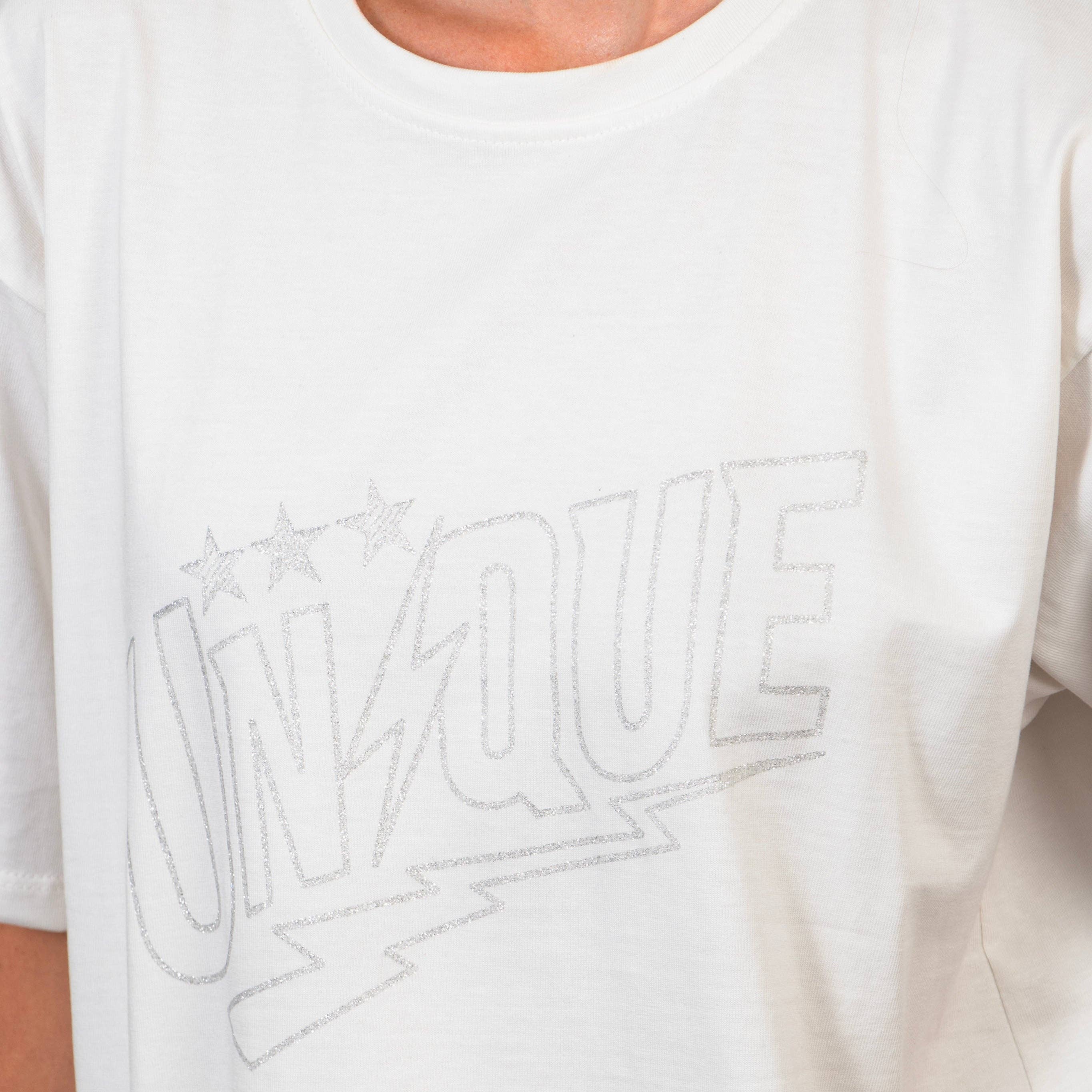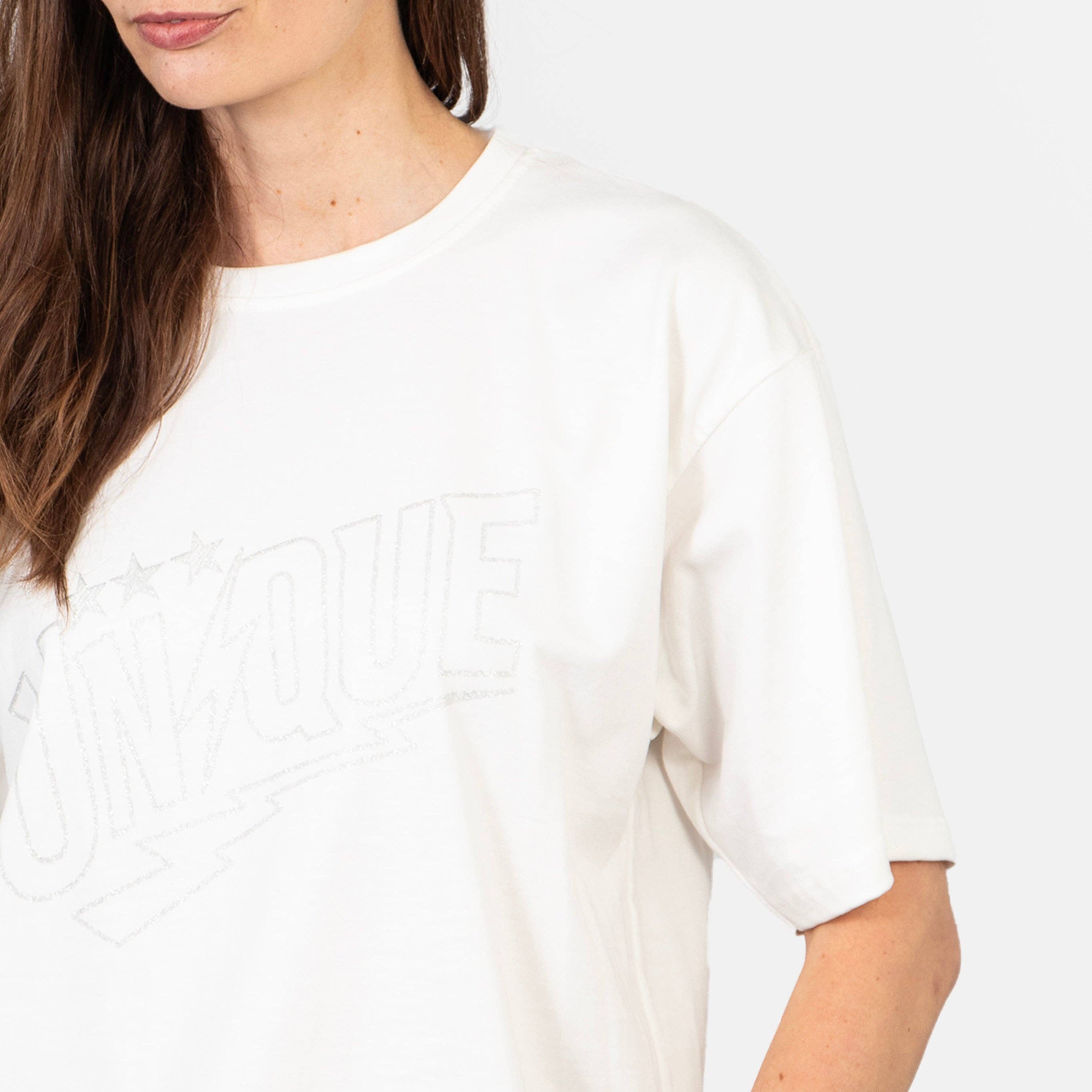 A relaxed-fitting graphic tee crafted from soft natural cotton. Showcasing an embellished glitter slogan, round neck and short sleeves. Versatile and playful, this T-shirt can be worn casually or as partywear.