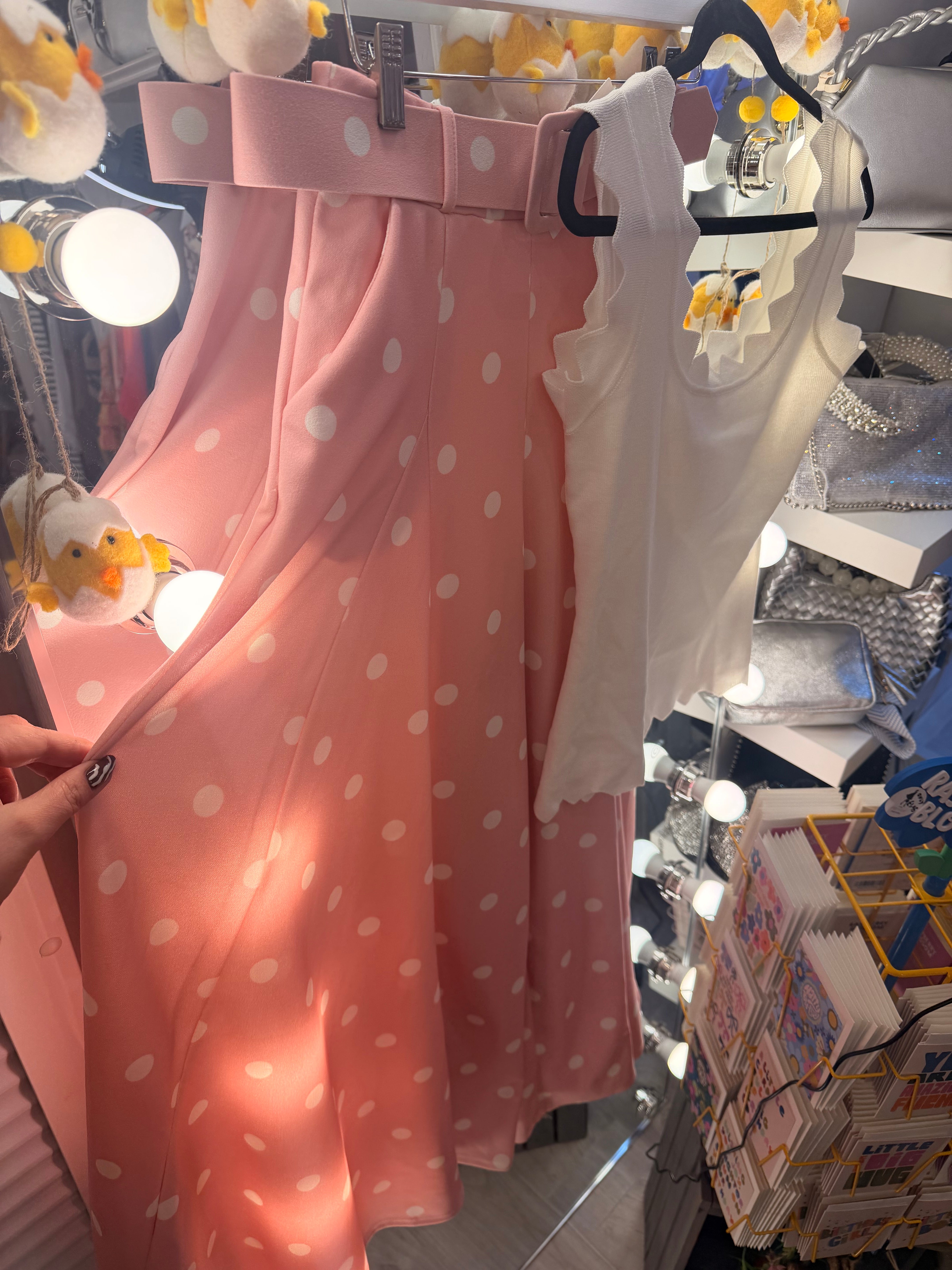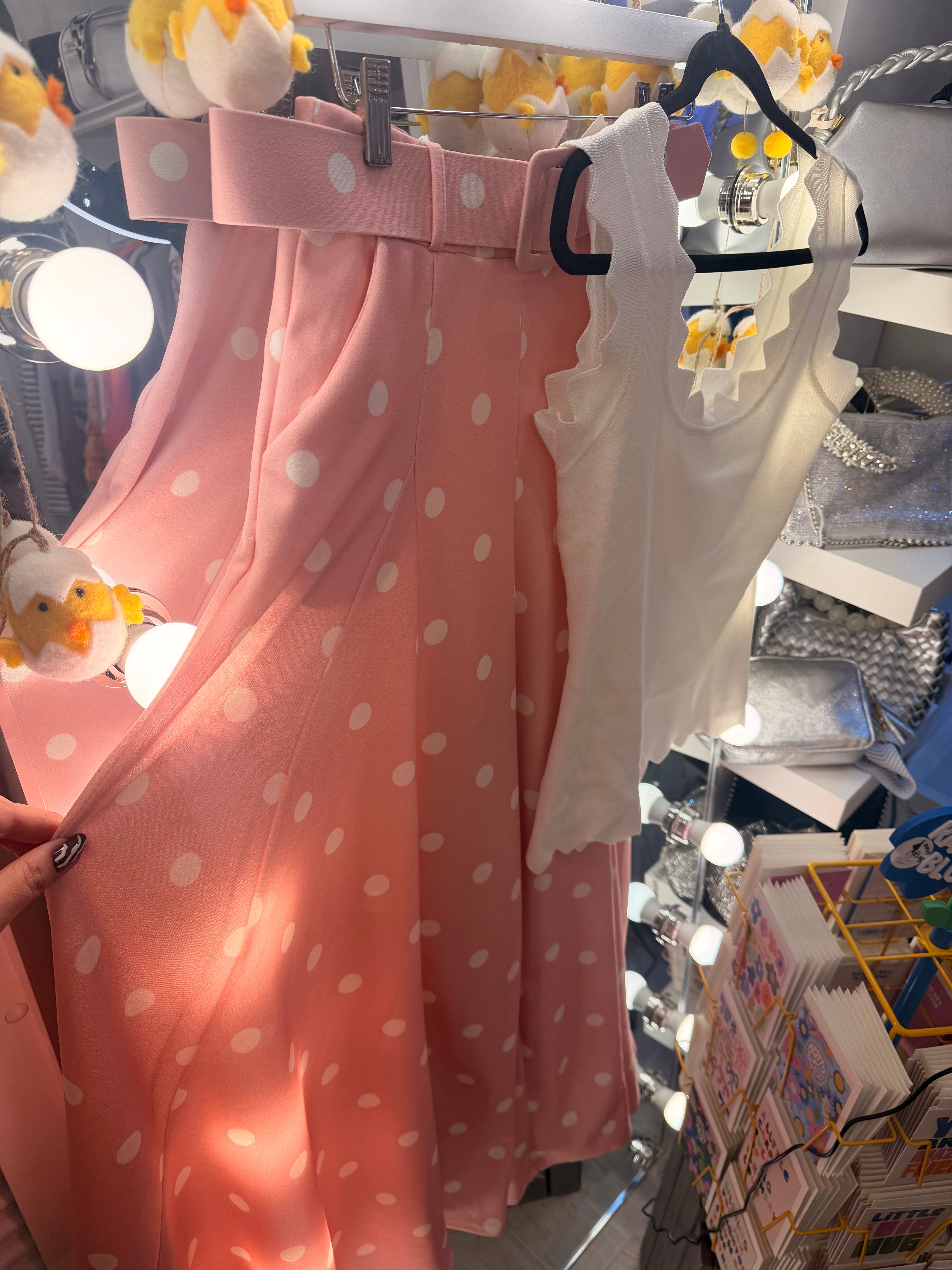 Pink high waisted polka dot palazzo trouser is backordered and will ship as soon as it is back in stock.