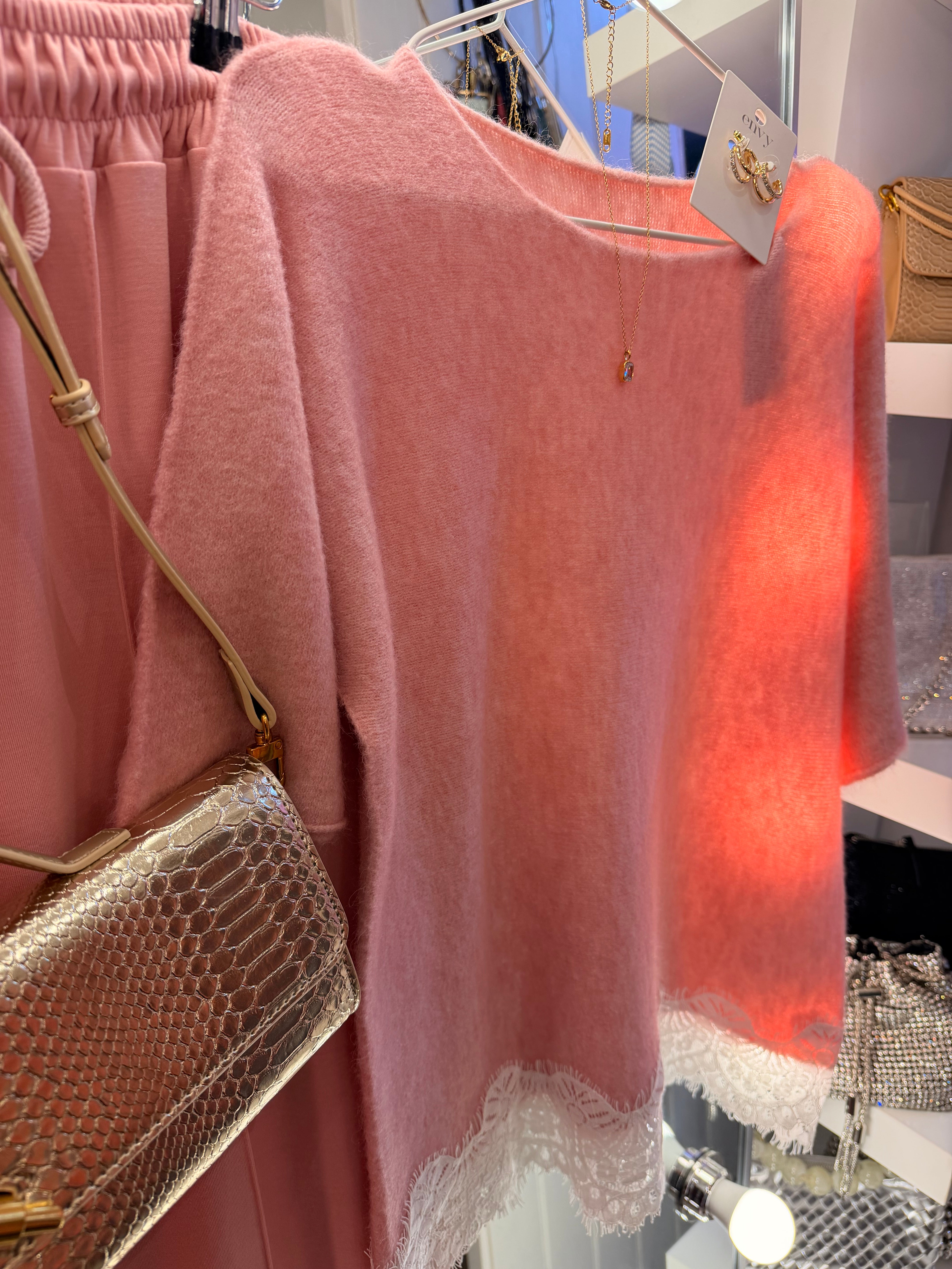 Pink lace detail soft knit jumper top is backordered and will ship as soon as it is back in stock.